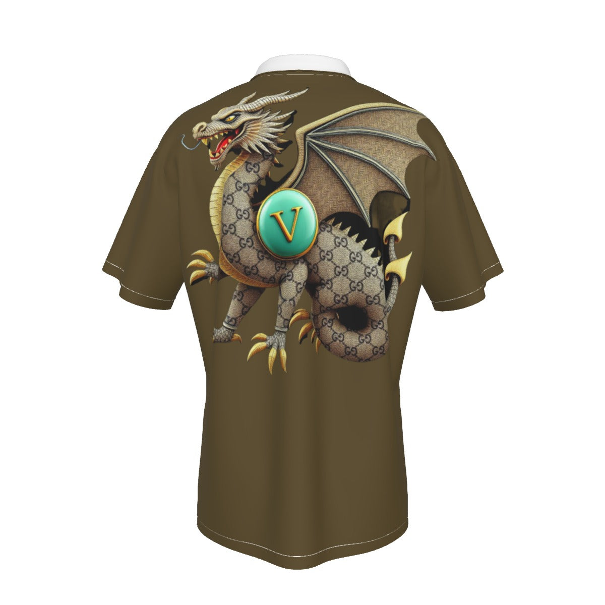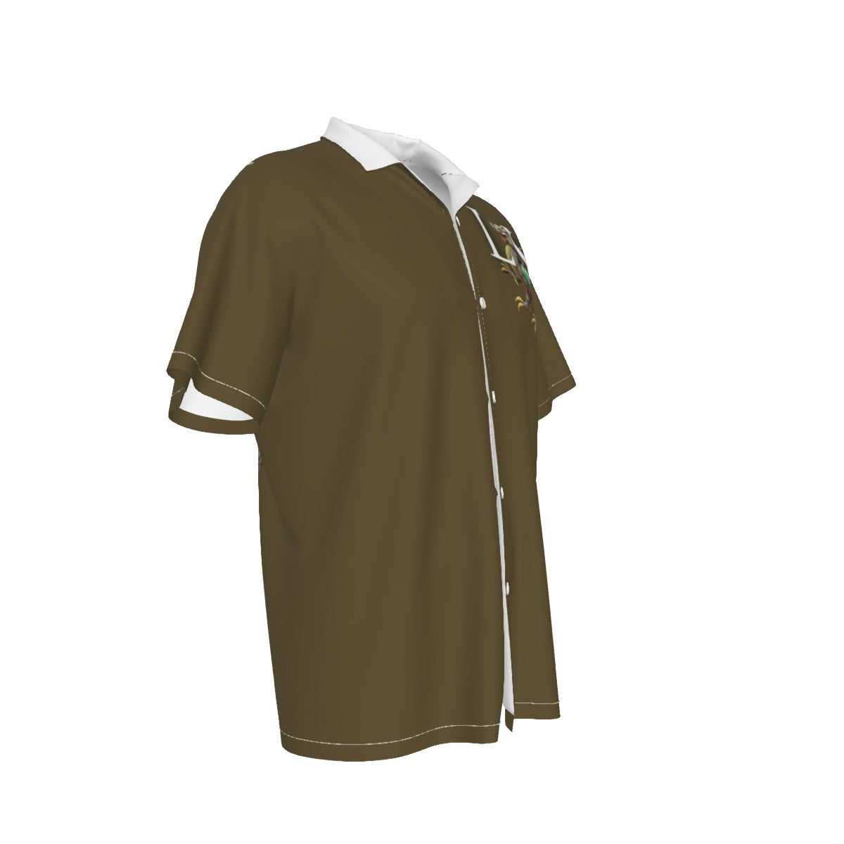 -Feature: Short sleeve, lapel collar, button closure, stitch color auto-matched to pattern