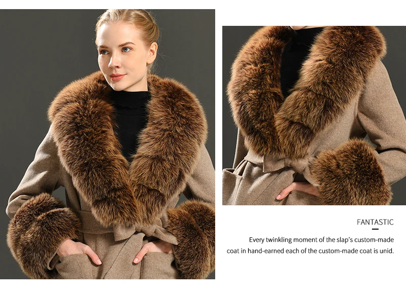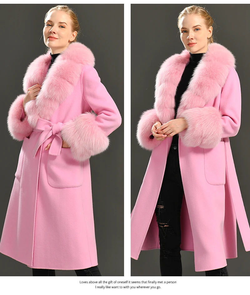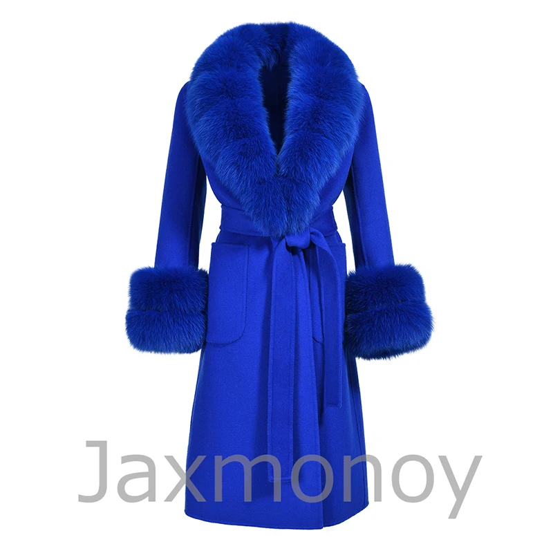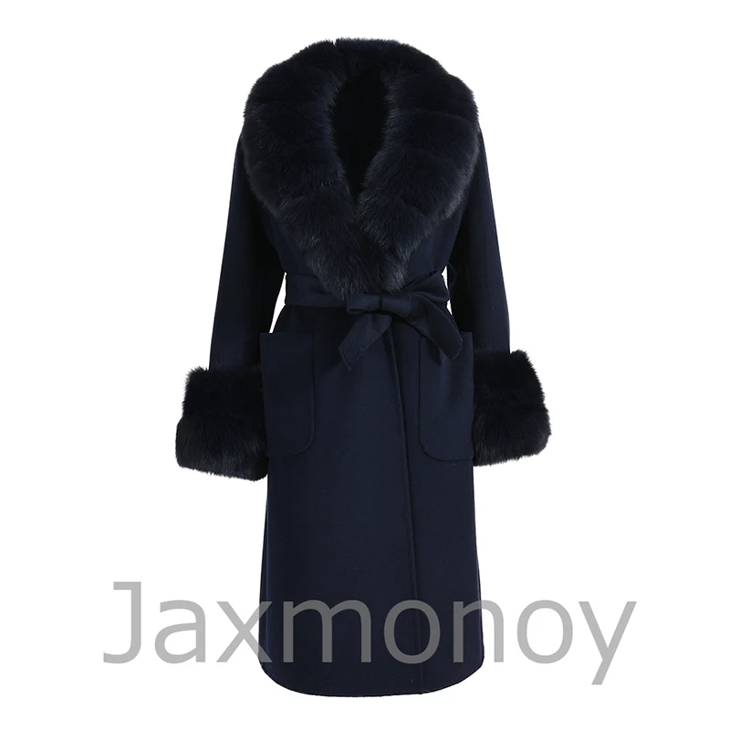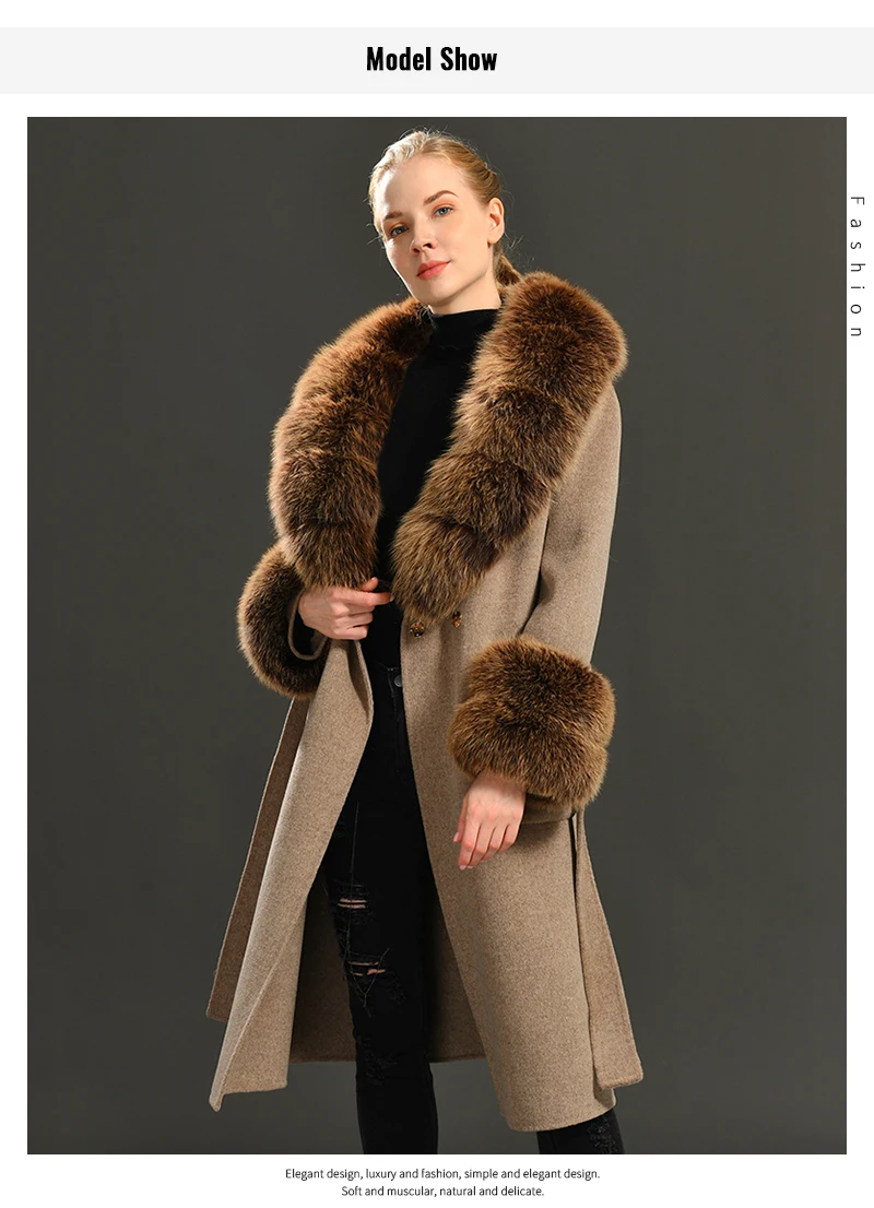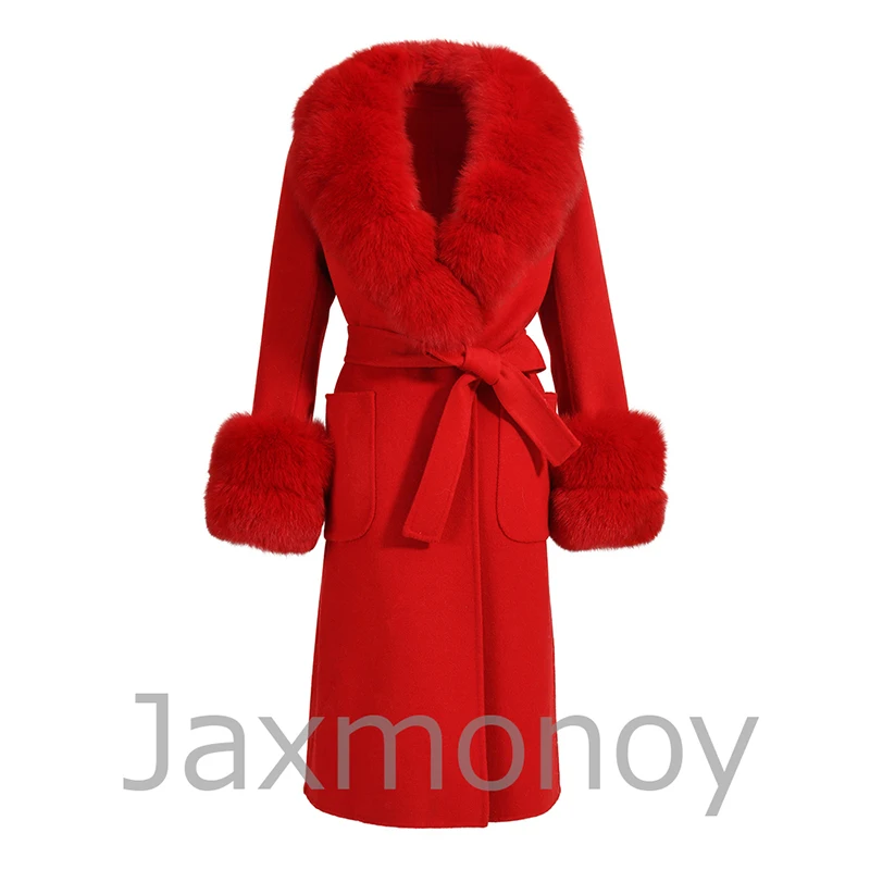 Jaxmonoy Cashmere Wool Trench Coat for Women Big Size Fur Collar Double Face Elegant Overcoat with Belt Spring and Fall Overcoat