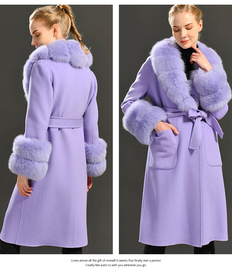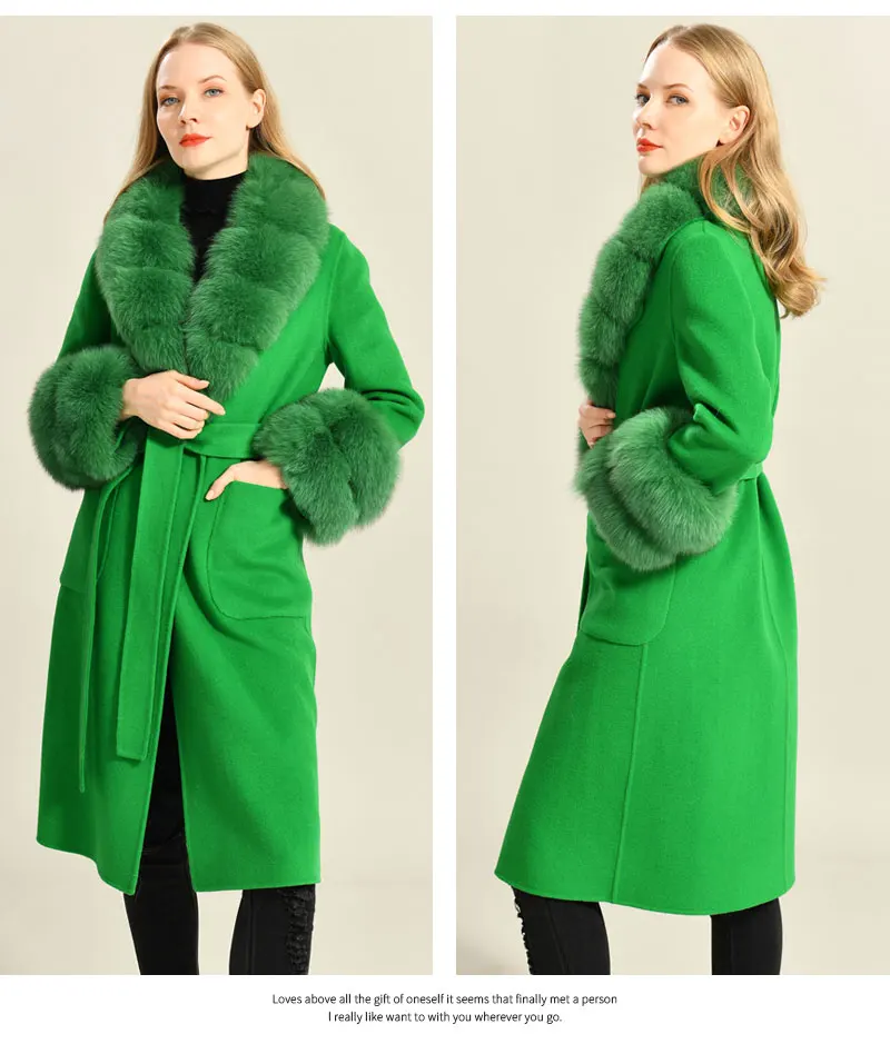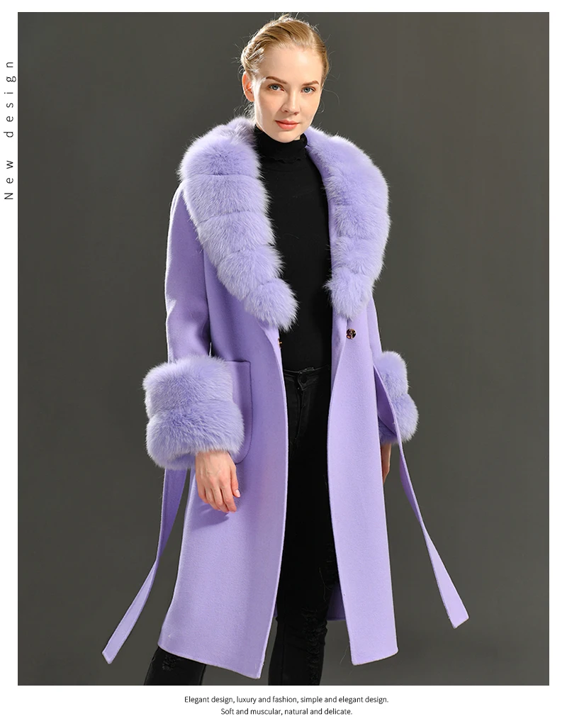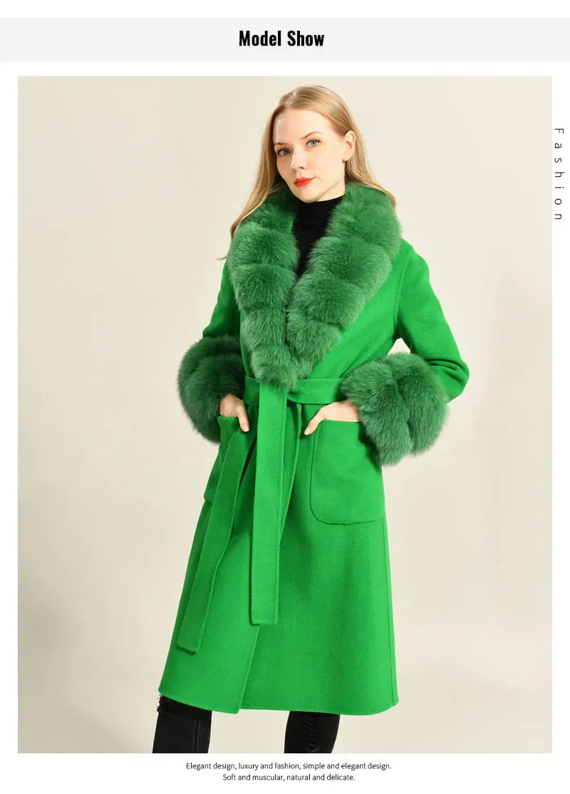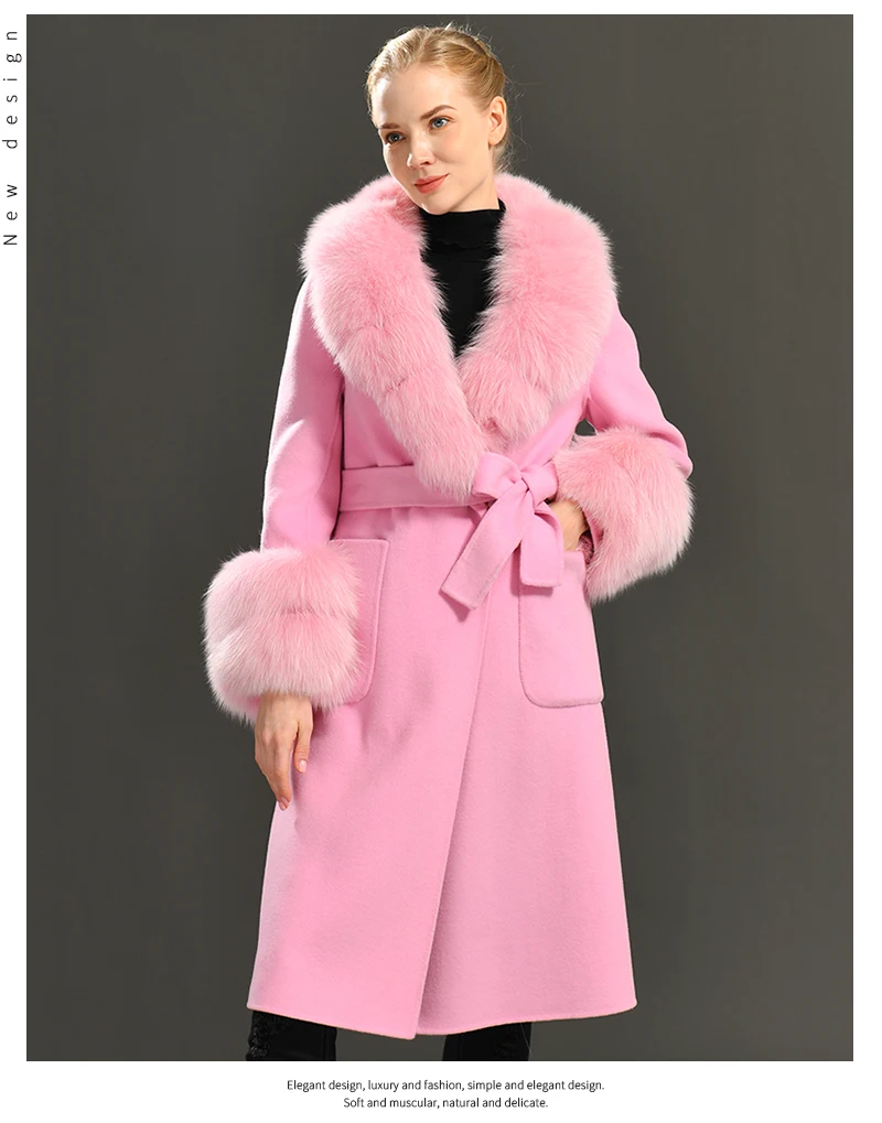 Jaxmonoy Cashmere Wool Trench Coat for Women Big Size Fur Collar Double Face Elegant Overcoat with Belt Spring and Fall Overcoat