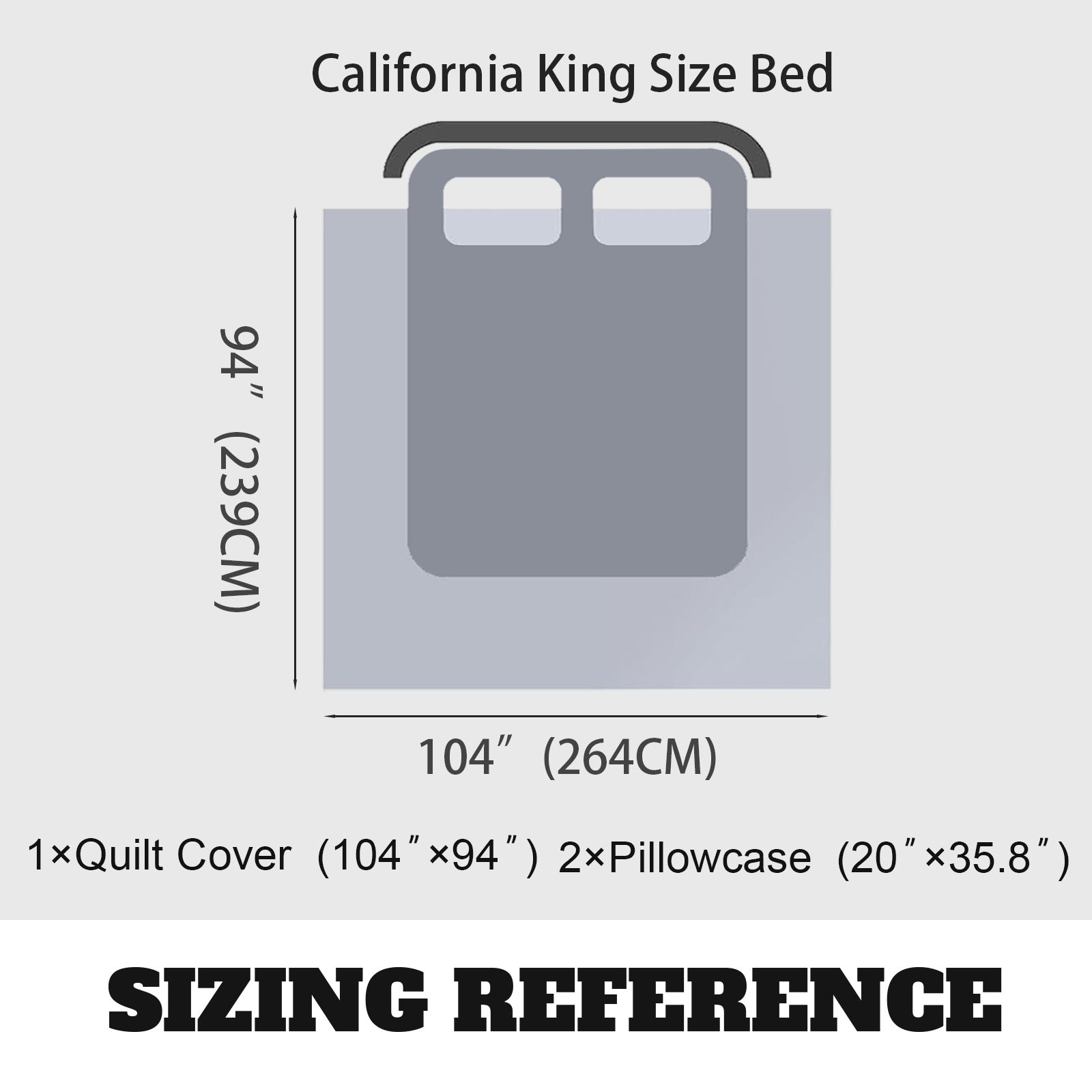 Duvet cover size: 94" x 104" (239 x 264 cm); Pillowcase size: 51" x 91".